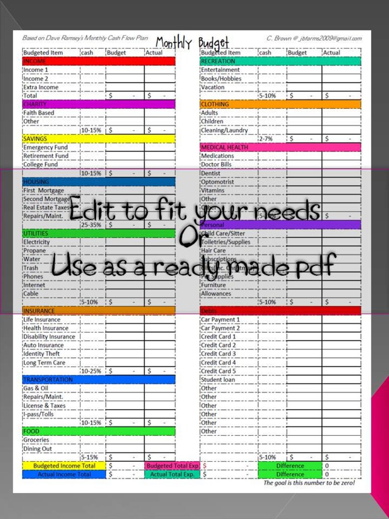 Monthly Cash Flow Plan Dave Ramsey Budget Templates